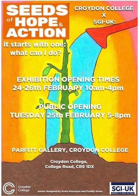 As part of a project exploring themes around ‘belonging’, students from Croydon College collaborated with SGI-UK to created art pieces inspired by panels from the Seeds of Hope and Action exhibition, which was held at the college in February this year as well as other places in the UK. The end of year show in Croydon College showcased their work across their time at the college.